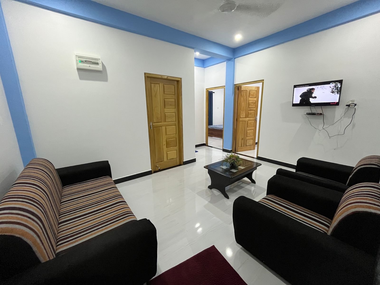 - Fully furnished living room with dining table, TV, sofa